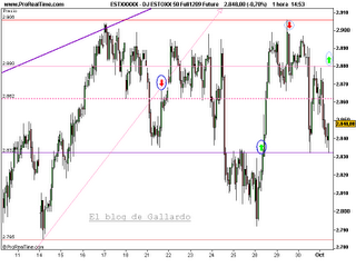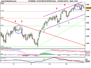Se coloca orden de venta del Estoxx a 2.863, en principio stop a 2.922, para darle suficiente filtro”. Esa operación fue cerrada el lunes 28 a 2.840, pero, dado que no he podido actualizar el blog, he considerado conveniente mantener la operación y dar un argumento técnico para una nueva apertura. La explicación es que tengo buenas amistades en Barcelona y me he ido a pasar las fiestas de la Mercè y a disfrutar de las bestias de fuego y del buen ambiente.