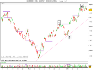 Los operadores que hayan seguido la señal estarían ganando una cierta cantidad. Ha hecho mínimo del día a las 16:46h en 8.571, casi100 puntos por contrato.