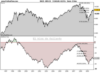 Si bien el valor numérico carece de relevancia en el indicador, el hecho de que curse bajo la línea cero ya es harto significativo. He optado por colocar los retocesos de Fibonacci para evidenciar la severa diferencia entre los pocos valores directores del índice y el conjunto del mercado. Mientras el Ibex 35 se acerca al retroceso del 61,8%, la amplitud del mercado ni siquiera alcanza el 38,2%. Es decir, todo lo contrario que la