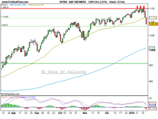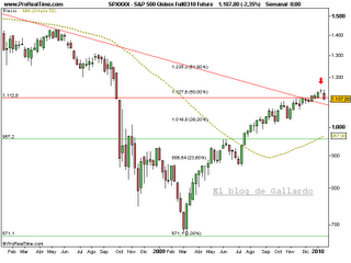 Por otro lado, en el gráfico semanal del futuro del S&P despunta una clara formación de estrella vespertina. El lugar es relevante en tanto que se produce sobre una zona de resistencia significativa: la pérdida de aquel soporte supuso el desplome del mercado en septiembre y octubre de 2008. Asimismo se encuentra sobre la superación de la línea de tendencia bajista de medio plazo y en el retroceso porcentual del 50% de todo el movimiento bajista previo.