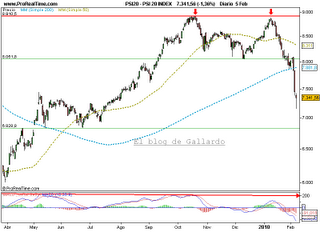 En el gráfico del índice de Portugal, Psi 20, se produce como en muchos otros índices y valores, en mayor o menor medida, una vuelta al origen de las fuertes caídas de septiembre y octubre de 2008. En esa zona se encuentra una fuerte resistencia que no es capaz de superar, se forma un patrón de vuelta, se pierde la directriz alcista, se pierde la zona de soporte clave y a continuación la media de 200 sesiones. Como consecuencia de todo lo anterior y de las divergencias que se habían ido manifestando durante toda la subida, el índice o valor sufre fuertes caídas.