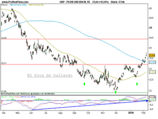 En el gráfico del ETF Power Shares DB US Dollar Index Bullish Fund se produce prácticamente lo contrario: vuelta a la zona de soporte de marzo de 2008, en esta zona encuentra apoyo y se forma un patrón de cambio de tendencia en forma de hombro-cabeza-hombro invertido. Se supera la zona de resistencia clave y a continuación la media de 200 sesiones. Como consecuencia de todo lo anterior y de las divergencias que se habían ido manifestando durante toda la bajada, tiene lugar un recorrido alcista.