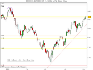No hay que olvidar que el Ibex 35 sigue muy alcista y que ha sido superada al cierre una nueva resistencia. La primera señal de giro a corto plazo se situaría sobre la figura de los 9.000. Otra cosa es que los operadores intradiarios con buenos resultados propusieran una operación de venta agresiva, una vez que se dieran por perdidos los 9.100 puntos, pensando en la pérdida de una directriz alcista de ultracorto plazo y en lo que debería ser ahora un soporte, apuntando quizá todo a un posible fallo alcista.