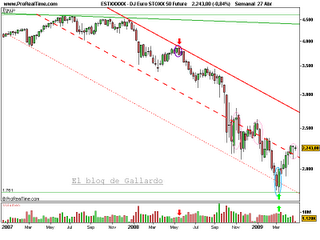 En marzo de 2009, en cambio, y a tenor de los requisitos anteriormente mencionados, se puede distinguir una muy poderosa pauta envolvente alcista El cuerpo de las velas es grande, sobre todo el cuerpo 2, cuyos mínimos son inferiores a los del cuerpo 1 y sus máximos son también superiores. Se produce además en un lugar definitorio, en la confluencia de una importantísima zona de soporte de medio-largo plazo y en la base de un gran canal bajista. El volumen no termina de acompañar en la generación del cuerpo 2, pero sí en la vela posterior, una vez queda perfectamente definida la pauta.