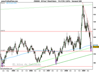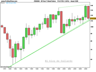 Dado que el precio de los bonos de más largo plazo ha descendido, parece que se descuentan presiones inflacionistas en un futuro próximo. La regla para seguir la posible evolución de los tipos de interés, conforme a la cotización de los contratos de futuros sobre bonos, tal y como expliqué en un artículo anterior, es muy sencilla: