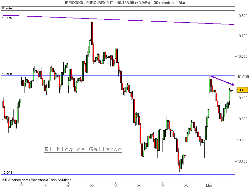 En el caso del Ibex, se puede apreciar una vuelta a una pequeña figura de hombro-cabeza-hombro invertida, pero en el retroceso se ha cerrado el hueco alcista y esa muestra de debilidad ha hecho desconfiar a los operadores y le ha impedido superar los máximos del día. Determinados detalles y apreciaciones son importantes y tienen consecuencias en la rentabilidad del operador. De hecho, mientras que el Dax se encuentra próximo a su gran zona de resistencia, el Ibex, en cambio, se mantiene alejado de los 10.800. El aspecto positivo es que mientras se mantenga por encima de la línea clavicular de la figura, en 10.285, podría llegar a acometer esa zona de 10.800.