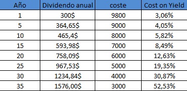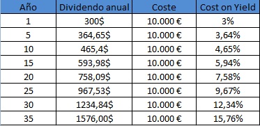 Pero un momento, no estoy contando los dividendos. Los dividendos han sido de 12.36$, por lo que debemos restar los dividendos a nuestro coste y nos queda de la siguiente forma, 22.07$ - 12.36$ = 9.71$ de coste real total. Si sacamos el yield on cost: 28.83% anual.