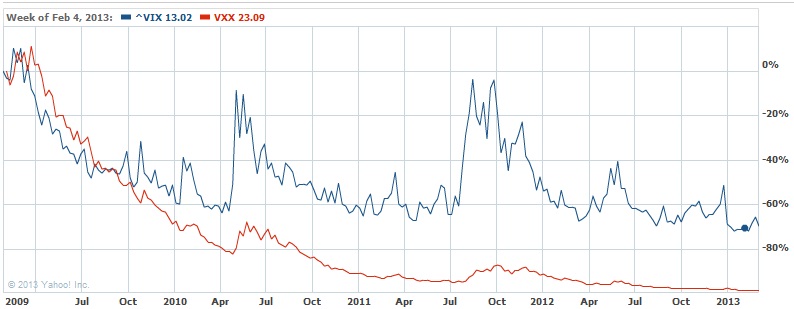 Como puedes ver oscila entre un determinado rango. A dia de hoy la volatilidad es muy baja. Ahora bien, si existiese un ETF que replicase exactamente la cotización de dicho indice sería bastante sencillo hacer dinero con ello. Compraríamos en niveles cercanos a 15 y venderíamos en niveles superiores. El problema es que no existe un ETF que lo replique exactamente. Existe un ETN que compra futuros para replicar dicho indice, pero debido a las comisiones y spread de hacer el rollover de los contratos (al entrar en contango), este ETF pierde muchisimo valor. Dicho ETF es el VXX. Aqui te dejo una gráfica del VXX y del indice VIX: