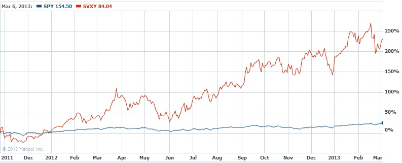 Para que veas bien la volatilidad te pego una grafica comparativa entre el SPY y el SVXY, una de corto plazo y otra con todo el historial: