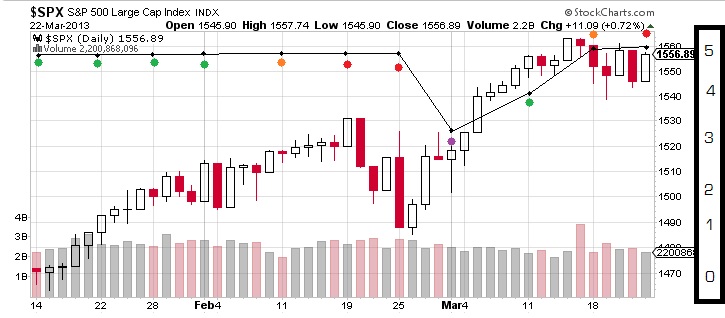 El primer mes es alcista hasta el 11 de febrero, donde la perspectiva del indicador nos dice que se va parando el impulso alcista que llevaba. Cambió a perspectiva bajista el 19 y 25 de febrero, y el 4 de marzo se produjo una minicorrección. No llegó a niveles inferiones a 3, por lo que nuestra perspectiva seguia siendo alcista, aunque con menos fuerza.