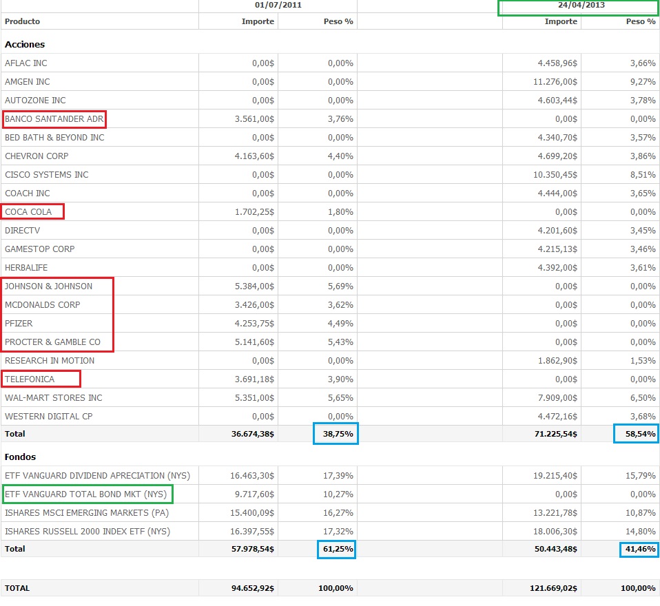 En rojo las salidas. También salen de la cartera los bonos y aumento la ponderación en Acciones en detrimento de los ETFs, aunque como puedes ver hay una buena base de ETFs, tanto emergentes como USA,