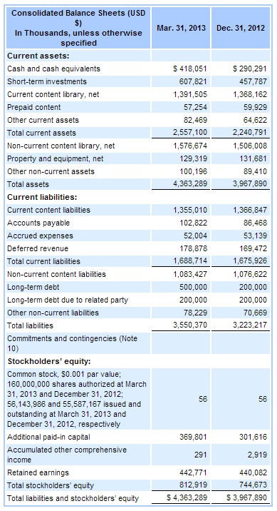 “The Company had $5.7 billion and $5.6 billion of obligations at March 31, 2013 and December 31, 2012, respectively, including agreements to license streaming content that represent current or long-term liabilities or that are not reflected on the Consolidated Balance Sheets because they do not meet content library asset recognition criteria. The license agreements that are not reflected on the Consolidated Balance Sheets do not meet content library asset recognition criteria because either the fee is not known or reasonably determinable for a specific title or it is known but the title is not yet available for streaming to members.”