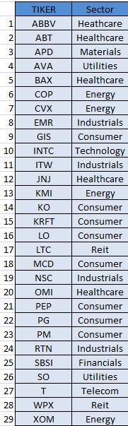 Como puedes ver son empresas la mayoría de ellas conocidas, aunque sean de USA, es perfectamente aplicable a empresas made in Spain. Hay empresas de diversos sectores, más grandes, más pequeñas, etc. Y lo que llama la atención es que son 29 empresas y existen por ejemplo 2 tabacaleras, 3 empresas que se dedican al negocio de petroleo, es decir, hay empresas repes. Esta puede ser perfectamente la cartera tipo de muchos inversores (sobretodo USA).