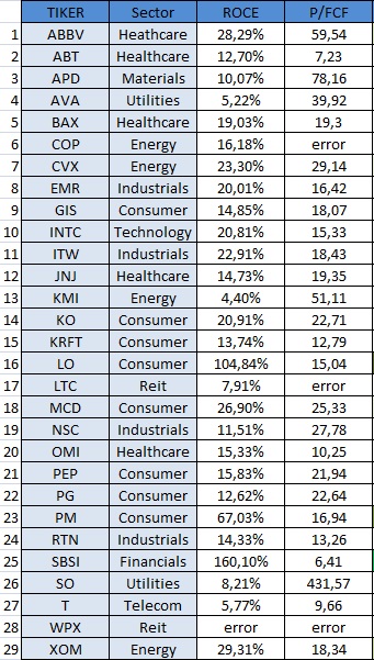 Vamos a ver ahora pues la lista de las 29 empresas anteriores con los ratios ROCEs y los Ratios P/FCF: