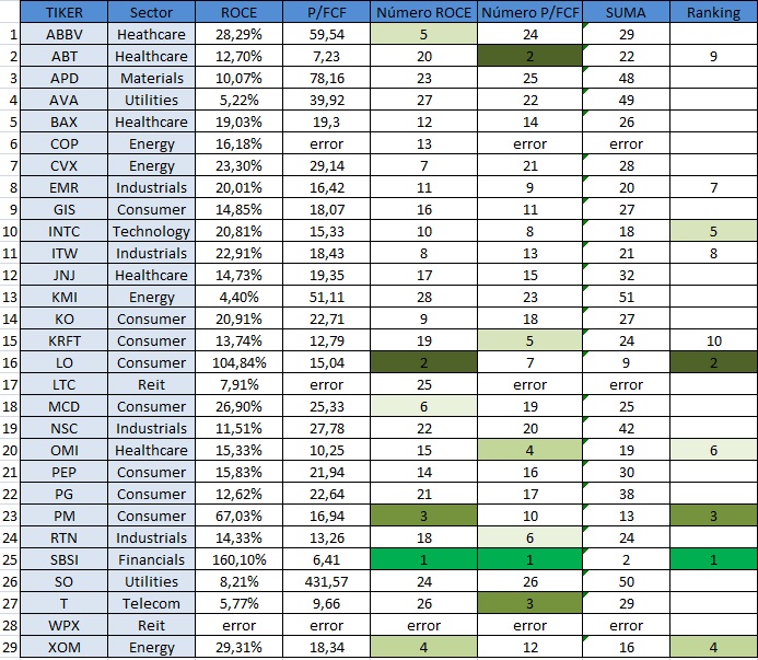 Al sumar los números del ROCE y del P/FCF tenemos la suma total. Para saber que empresa es mejor sumamos los 2 números y nos dará las mejores empresas con números más bajos, mientras que las empresas con números de suma más altos serán las peores.