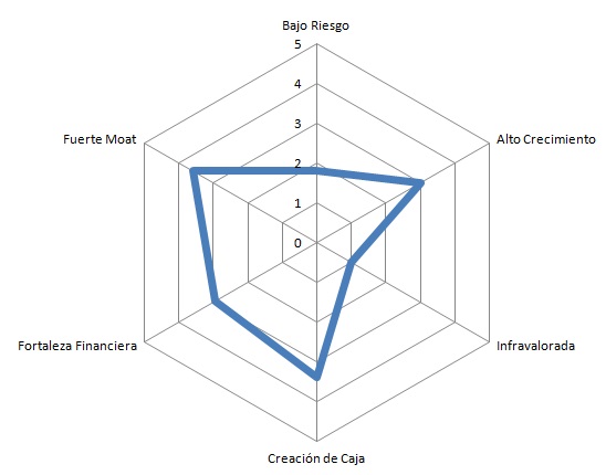 La empresa falla por la parte de Valoración, pero teniendo en cuenta lo que hemos comentado de la empresa no es un problema tan grande. Debido al precio de esta empresa el riesgo no es muy bajo, ya que para que una empresa tenga un riesgo bajo, entre otras tiene que tener un precio apropiado, siempre será menos arriesgada la empresa a 40$ que a 50$ y también será mucho menos arriesgada a 30$ que a 40$.