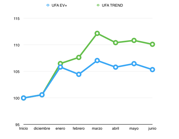 La cartera UFA EV+ (Programa de gestión de Retorno Absoluto) ha perdido un 1,05% durante este mes de Junio por lo que acumula una rentabilidad del 4,75% durante este año 2015 y de un 5,35% desde su puesta en marcha en Diciembre del 2014. (Cifra oficial de cuentas reales de las que ya están descontados los gastos de gestión y las comisiones por cada operación realizada). La cartera UFA TREND ha perdido un 0,66% en este mismo período y acumula una revalorización del 9,52% desde el inicio del año y de un 10,12% en Diciembre del 2014.