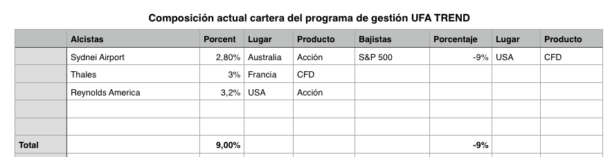 En lo que llevamos de mes de septiembre ambos programas lo están haciendo bien. El UFA EV+ (de retorno absoluto) ha estado generalmente con posiciones cortas netas desde principios de este mes. Actualmente, tiene posiciones alcistas por el 9% de la cartera y posiciones bajistas por el 27,8%. El programa UFA TREND, de gestión tradicional (sólo posiciones alcistas netas en cartera), está totalmente cubierto con un 9% de posiciones largas y un 9% de cortos con CFDs del índice S&P 500. Los valores alcistas corresponden a valores fuertes con amplia tendencia alcista y cotizando en sus máximos históricos o muy cerca de éstos.