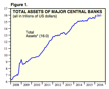 Tampoco lo estaba años más tarde que entidades financieras a lo largo de todo el globo pudiesen quebrar, ni que tras rescatar a estas e intentar enmedar los efectos de la crisis financiera, algunos estados se quedasen al borde de la bancarrota. De repente, llegaron los salvadores Bancos Centrales a fagocitar el virus de la deuda que tantos cadáveres ha dejado en las cunetas. ¡Con lo sencilla que era la solución, cómo es que no se nos había ocurrido antes!. Imprimimos dinero y con él compramos esa deuda que pocos quieren. Metemos esa deuda en nuestro balance y listo. En el siguiente gráfico se puede ver la evolución del balance de los principales Bancos Centrales mundiales.