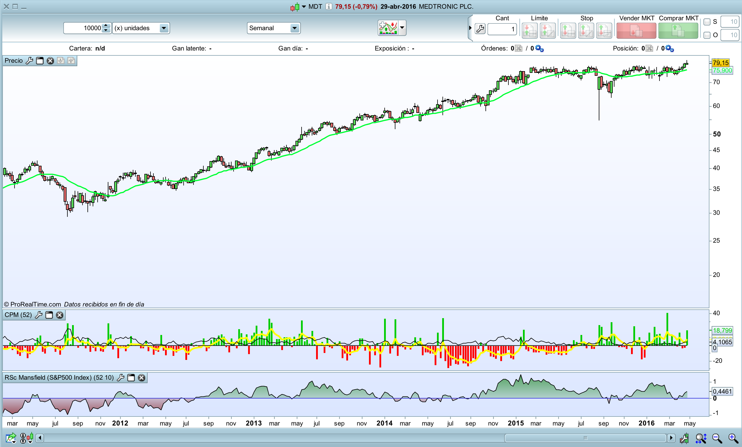 Durante estos dos días hemos añadido únicamente dos valores a la cartera, Medtronic y Charter Communications, que son un buen ejemplo del tipo de compañías que buscamos, valores con clara tendencia alcista, que estén cotizando en sus máximos de los últimos años y que pertenezcan a sectores que tengan un comportamiento relativo mejor que el S&P 500.