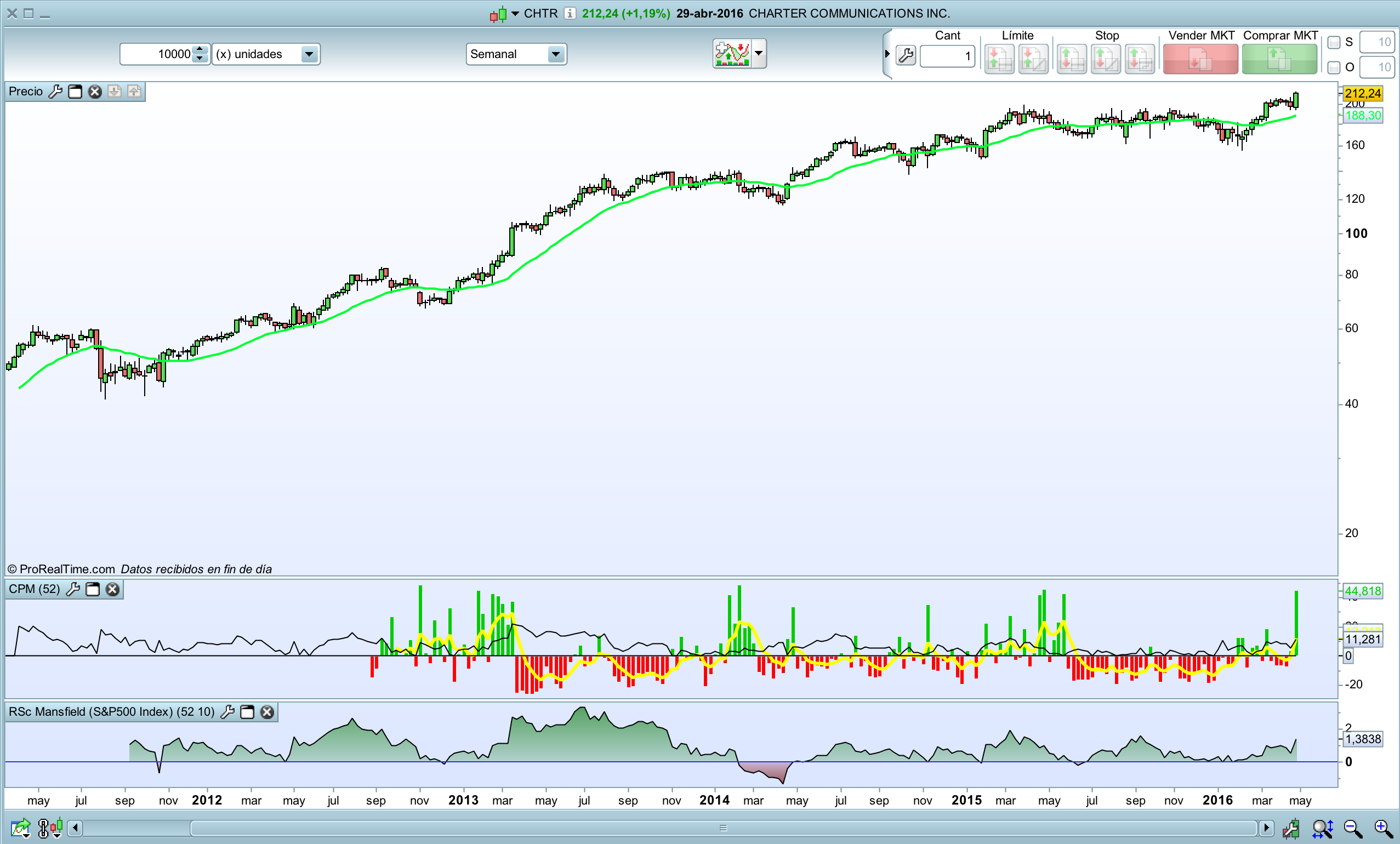 La otra compañía que hemos comprado esta semana fue la empresa del sector de medios de comunicación Charter Communications que compramos el viernes a un precio de 208,10$ (3% de la cartera). Se trata de una compañía que cotiza actualmente también en sus máximos históricos, perteneciente al sector de medios de comunicación americano (Un sector que está ganando fortaleza alcista en estas últimas semanas). El stop loss de esta operación lo hemos situado en la zona de los 189$.