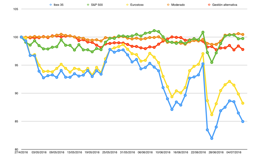 Ha sido un mes complicado para la renta variable tras el Brexit como evento inesperado, que trajo consigo la mayor caída de la historia del Ibex el pasado día 24 de junio. Ese día post-Brexit los principales índices europeos tuvieron un hueco de apertura superior al 10%. En el siguiente gráfico podéis ver la evolución diaria de mis dos programas de gestión en comparación con el Ibex, el Eurostoxx y el S&P 500, en el que se puede observar claramente su menor volatilidad con respecto a estos índices. El día 24 de junio, un verdadero test de estrés para todas las carteras bursátiles, el Ibex cayó un 12,35%, el Eurostoxx un 8,62% y el S&P 500 un 3,59%. Ese fatídico día, el programa Moderado Tendencial (que tiene en cartera un 50% de renta variable y un 50% de liquidez) lo hizo sólo un 0,72% y el de Gestión Alternativa un -1,05%.