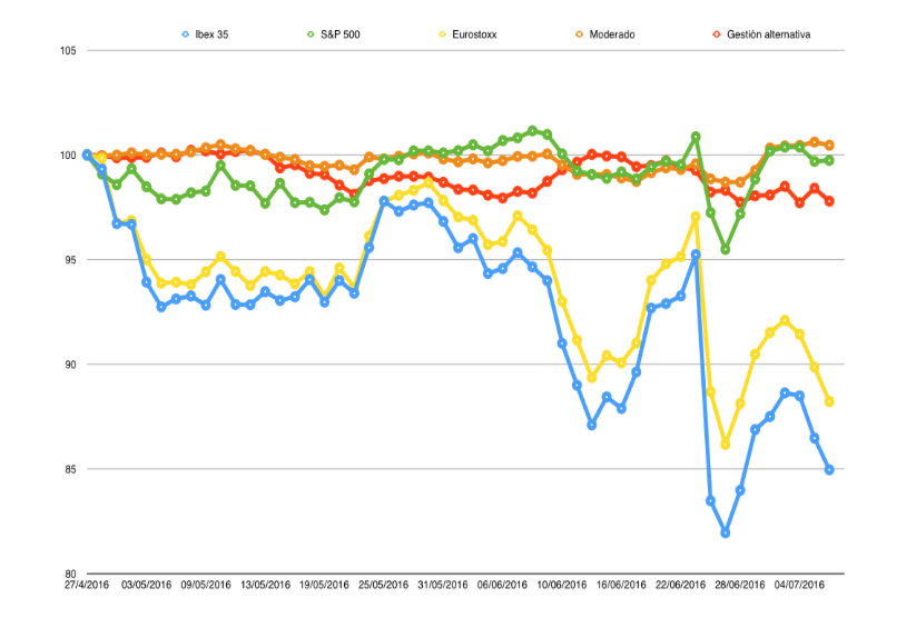 El modelo tendencial moderado ha ganado en el mes de julio un 0,67% y acumula desde el inicio de la gestión el 28 Abril de 2016 una ganancia del 0,95% (Resultado neto después de descontar todas las comisiones de intermediación y gestión). El modelo de gestión alternativa ha perdido en julio un -2,82% y acumula una pérdida del -4,93% desde su inicio el 28 de abril de 2016. (Resultado neto después de descontar las comisiones de intermediación y gestión). Desde el día en que comenzamos con la gestión de estos dos programas, el Ibex 35 ha perdido un -7,99%, el Eurostoxx ha perdido un -4,45% y el S&P se ha revalorizado un 3,73%.