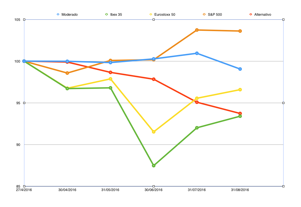 El modelo tendencial moderado perdió en el mes de agosto un -1,87% y acumula desde el inicio de la gestión el 28 Abril de 2016 una perdida del 0,95% (Resultado neto después de descontar todas las comisiones de intermediación y gestión). El modelo de gestión alternativa ha perdido en agosto un -1,42% y acumula una pérdida del -6,28% desde su inicio el 28 de abril de 2016. (Resultado neto después de descontar las comisiones de intermediación y gestión). Desde el día en que comenzamos con la gestión de estos dos programas, el Ibex 35 ha perdido un -6,61%, el Eurostoxx ha perdido un -3,42% y el S&P se ha revalorizado un 3,61%.