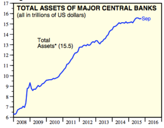 En los últimos años los principales Bancos Centrales han puesto en marcha la flexibilización cuantitativa o Quantitative Easing y han aumentando su balance (ver gráfico inferior) con compras de deuda de diversos tipos hasta niveles insostenibles a largo plazo.