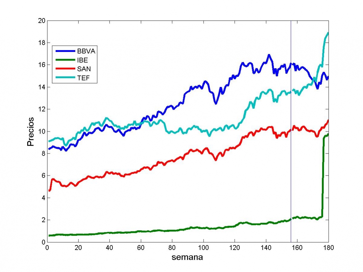 El siguiente gráfico muestra la evolución de los precios de estas empresas a lo largo de 3 años determinados (156 semanas). Nosotros estamos en la semana 156 del gráfico y queremos invertir nuestro dinero de la semana 157 a la semana 180. Simplemente por ilustrar, basaremos nuestra decisión en la información proporcionada en el gráfico.