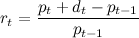 En primer lugar, necesitamos calcular la rentabilidad en bolsa de una empresa en un determinado momento, t. Es simplemente el cambio porcentual del precio respecto al periodo anterior, t-1. En términos matemáticos, la rentabilidad en el periodo t es: