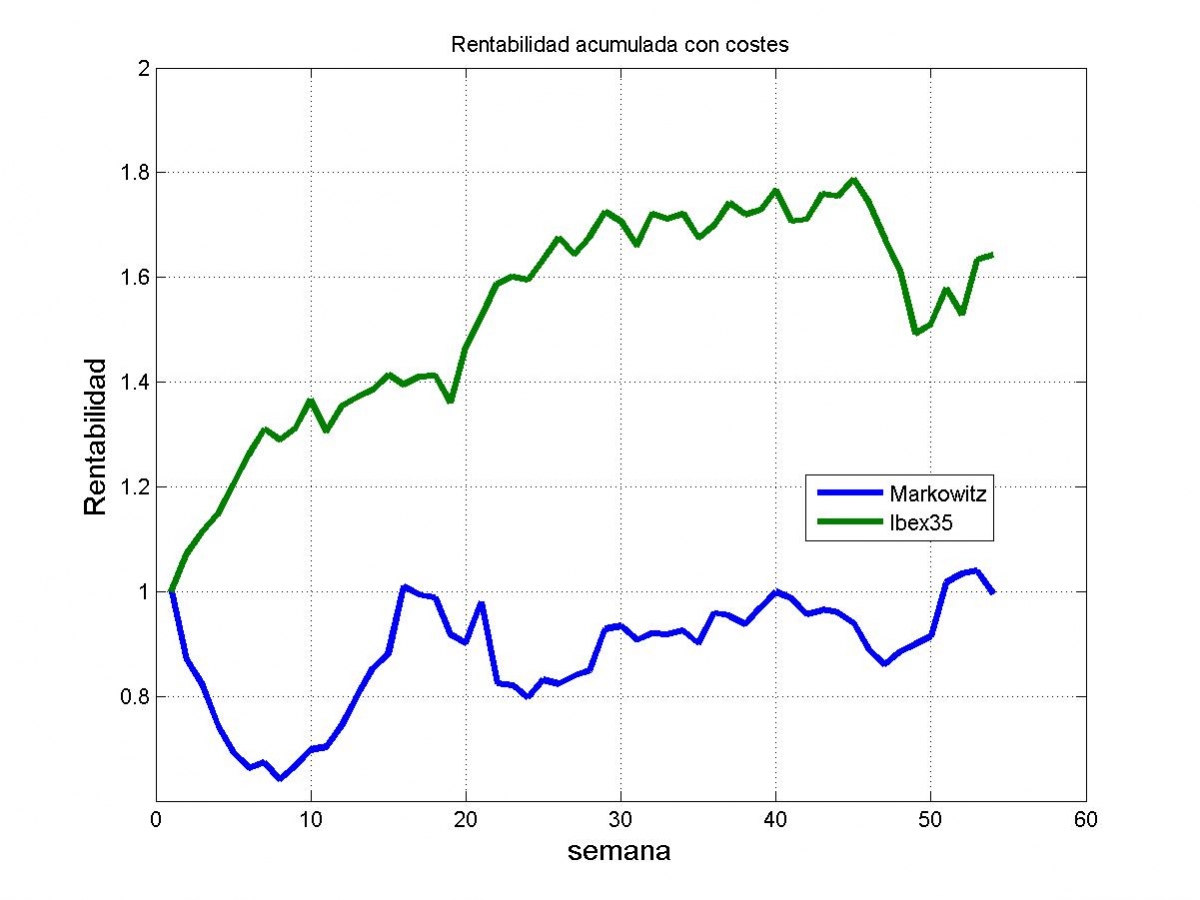 Con el Ibex hubiésemos ganado más de un 60% en ese determinado periodo. Con la cartera de Markowitz nos hubiésemos quedado igual al finalizar el periodo: o sea, un desastre.