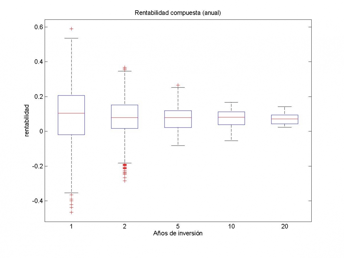 Cada caja contiene las rentabilidades compuestas anualizadas para cada horizonte de inversión. Las líneas rojas de cada caja representan aproximadamente la rentabilidad media anual obtenida en cada horizonte. Se puede observar que, independientemente de si somos inversores a corto, medio o largo plazo, la rentabilidad media anual es aproximadamente del 10% en todos los casos.