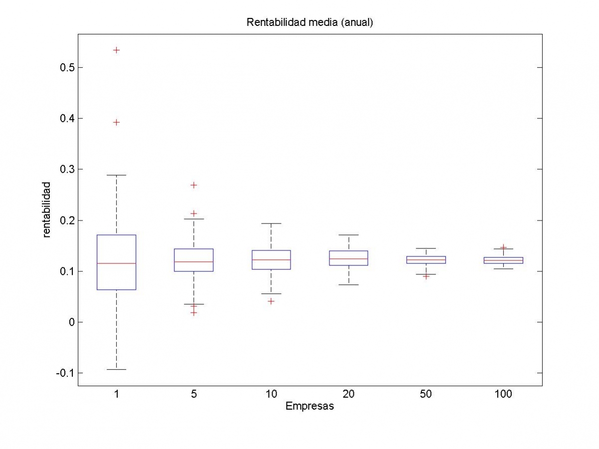 Pero como decía antes, basta con escoger convenientemente 10 o 20 empresas para conseguir los mismos niveles de riesgo que una cartera de 100 empresas. Por ejemplo, en la caja de 10 empresas se observa que existen subconjuntos de 10 empresas con riesgos similares o incluso inferiores al de carteras con 100 empresas. En la práctica es posible encontrar alguno de estos subconjuntos, estudiando convenientemente las volatilidades y correlaciones de las empresas.