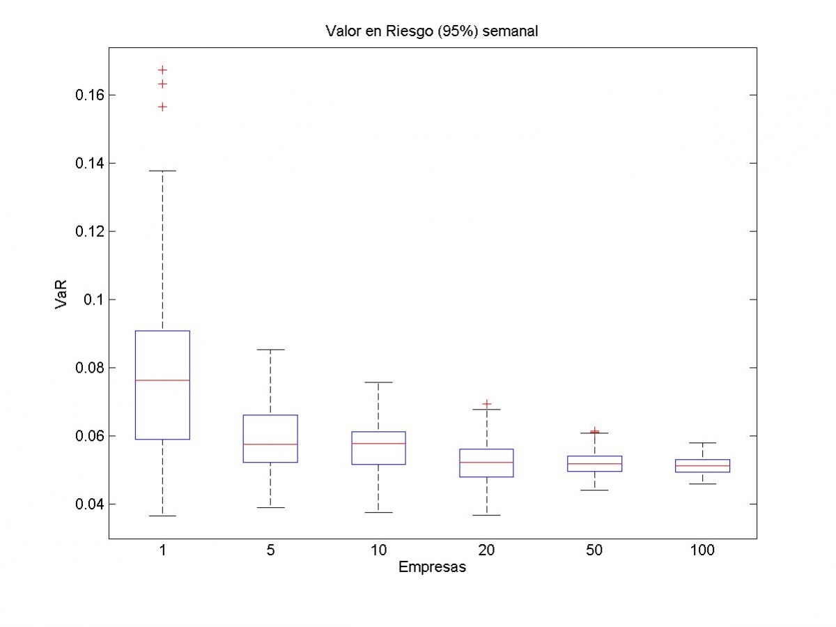 Se puede observar que con una sola empresa, la mayor parte de las veces la máxima pérdida semanal oscila bastante alrededor del 7.5%. En cambio, para una cartera de 100 empresas, la máxima pérdida semanal estaría muy centrada en el 5%, independientemente de cómo hayamos escogido esas 100 empresas.