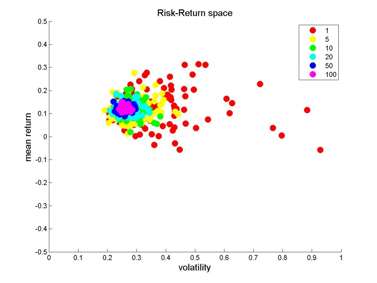 En el gráfico aparecen 600 puntos (carteras) agrupados por color (cada color representa un tamaño de cartera). Por ejemplo, un determinado punto rojo representa el riesgo (volatilidad) y la rentabilidad media, obtenidos en los últimos 5 años, de una cartera que escoge al azar una única empresa. Se puede observar el comportamiento errático de este tipo de carteras tan poco diversificadas. La volatilidad oscila entre el 20% y el 100%, y la rentabilidad oscila entre el -10% y el 30%.