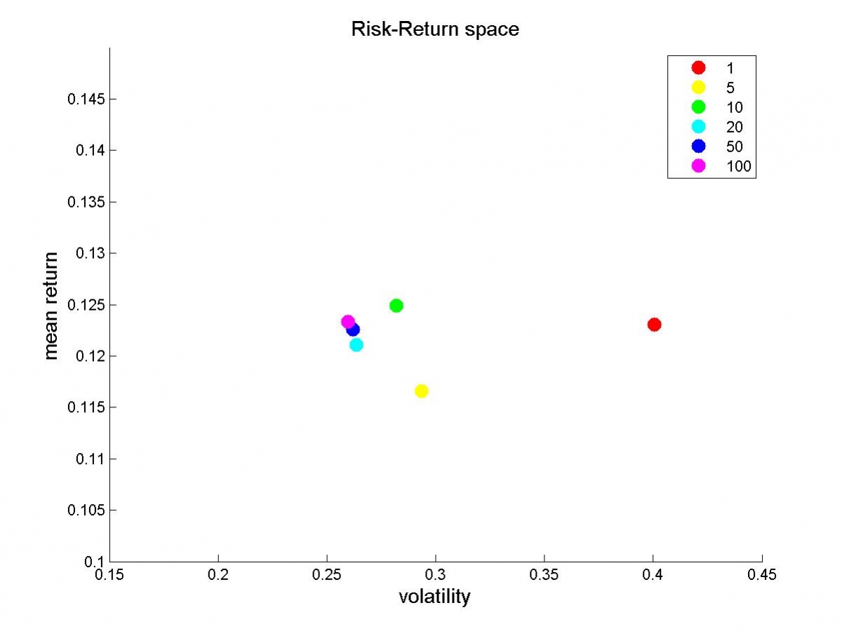 El siguiente gráfico evidencia aún más el efecto de la diversificación en el riesgo y la rentabilidad obtenida de nuestra cartera. Ahí se muestra el comportamiento en el espacio riesgo-rentabilidad de todas las carteras que he considerado en el experimento: 100 carteras distintas para cada uno de los 6 tamaños. Podéis ver la entrada “Comparación eficiente de estrategias de inversión” donde se introduce este gráfico.