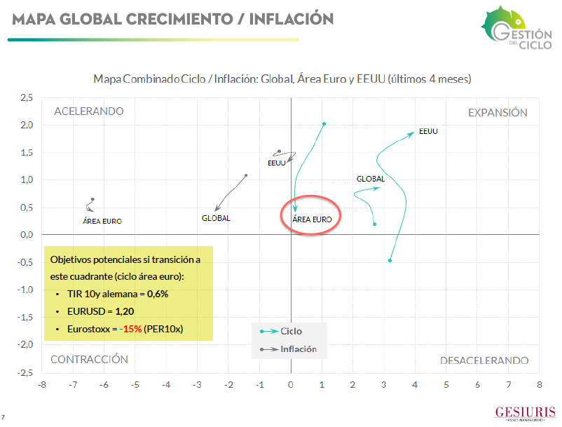 Veamos en qué punto del ciclo se encuentra EEUU, Área Euro y Economía Global para identificar temas de inversión. Esta es la foto actualizada: