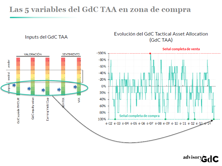 Señal completa de compra. El pasado 10 de octubre las cinco variables con las que construimos el GdC Tactical Asset Allocation (Gdc TAA) se situaron en zona de compra. El resultado fue una lectura del +100% en GdC TAA, la quinta señal completa de compra que observamos en los últimos 13 años. Un breve recordatorio de las cinco variables del GdC TAA antes de analizar las consecuencias de esta señal completa de compra: