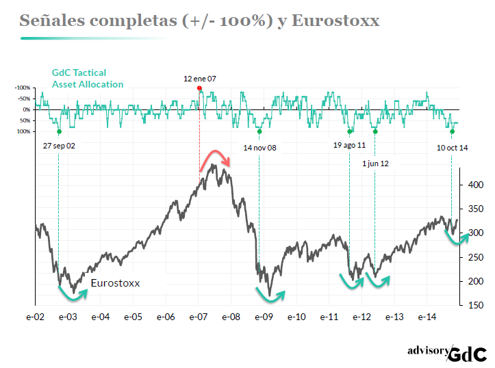 Apertura de ventana para la formación de un suelo. En el análisis de anteriores señales completas (4 de compra y 1 de venta) observamos que la lectura del +/- 100% en GdC TAA es compatible con la formación de un suelo o techo de mercado relevante. En el caso de la señal completa de compra, la formación del suelo que se desarrolla en las semanas/meses posteriores al +100% incluye, en la mayoría de los casos, la ruptura de los mínimos en los que se dio la señal. Así, cabría esperar que, en el proceso de formación de suelo que sugiere el +100% del 10 de octubre, el Eurostoxx revisite esos mínimos. Un movimiento bajista que se podría aprovechar para incrementar la exposición a renta variable.