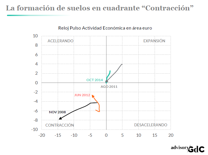 Hoy, como en anteriores señales completas de compra, tenemos a nuestro reloj de pulso en actividad económica apuntando al cuadrante de contracción. Las formaciones de suelo se producen cuando los indicadores adelantados de actividad apuntan a un escenario de contracción. El ajuste de valoraciones a ese escenario, tanto de la renta variable (contracción de PER) como de la renta fija (caída de TIR), así como el incremento en volatilidad implícita o el pesimismo en las encuestas de sentimiento de inversores es un proceso con tendencia a retroalimentarse y que suele provocar sobre-reacciones. Lo mismo sucede, pero al contrario, en las formaciones de techo que suelen aparecer en el cuadrante de expansión.