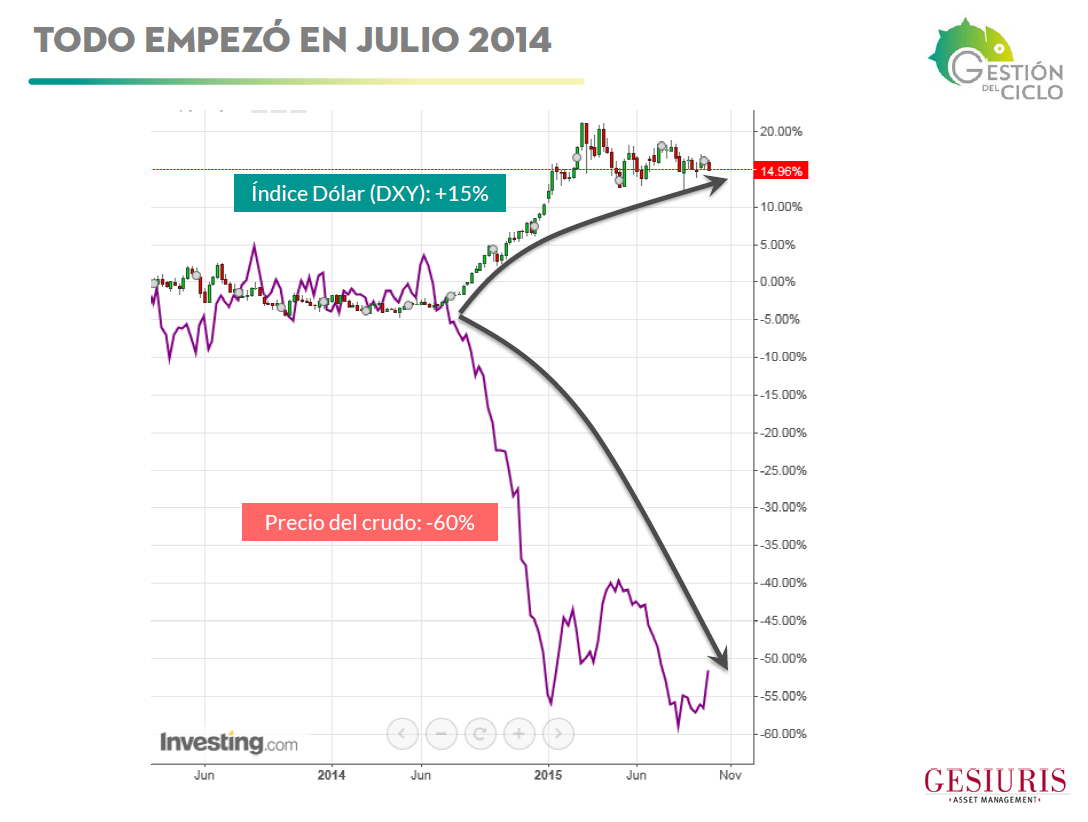 El mes de julio de 2014 ha marcado un antes y un después en la dinámica del ciclo global, siendo el epicentro de los bruscos movimientos que estamos observando en los mercados financieros en los últimos meses. Un epicentro con las siguientes coordenadas: julio 2014; dólar +15%; petróleo -60%.