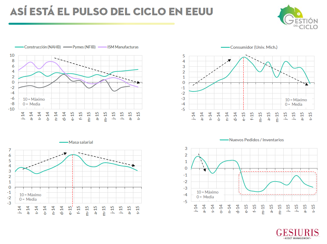Pero desde diciembre de 2014 el consumidor ha dejado de confiar, y la masa salarial real ha perdido aceleración . Deterioro que sugiere una filtración desde la primera capa del tejido industrial sensible a tipo de cambio (apreciación USD), al conjunto del sector manufacturero (enfriamiento ciclo global) y, por último, a las expectativas del consumidor (desaceleración ritmo creación de empleo). Un círculo vicioso que ha llevado a nuestro reloj del ciclo a situar en el cuadrante de contracción a EEUU.