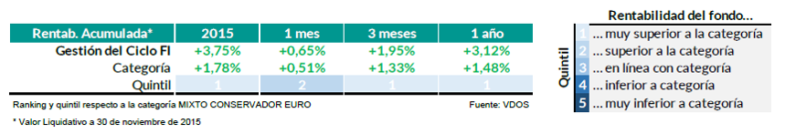 Así fue el mes. Gestión del Ciclo FI se revaloriza un +0,65% en noviembre, cerrando el mes con un valor liquidativo en 10,22€. La rentabilidad acumulada en 2015 es del +3,75%. Dos posiciones en cartera han destacado sobre el resto en la generación de rentabilidad del pasado mes, y las dos comparten la apreciación del dólar (pasa de 1,10 a 1,05 en noviembre) como elemento catalizador: (1) posiciones inversas sobre la deuda EEUU: la subida de los tipos de interés a largo plazo en EEUU ha sido capitalizada por el double short 10y US Treasury que gana un +5,3% en el mes. (2) RF Corporativa Emergente: una posición que, al estar referenciada a un índice en dólares, se ha visto favorecida por la apreciación de la divisa y cierra el mes con una subida del +4,2%. En el lado negativo, las posiciones en oro (cae un -4% en noviembre) han drenado rentabilidad a la cartera del fondo, si bien ha sido un drenaje mínimo al suponer la exposición a oro apenas un 1,3% de la cartera total.