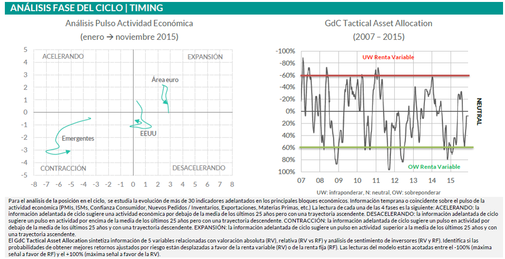 Análisis posición en el ciclo y monitor de timing. El análisis de los indicadores del último mes arroja un balance con sesgo neutral / negativo. La noticia positiva la encontramos en la información adelantada de ciclo en el bloque emergente. Sigue en el cuadrante de contracción, pero la dirección de la información (flecha en el gráfico inferior izquierdo) apunta a un freno en el deterioro de los últimos trimestres. En el lado opuesto, el área euro se mantiene en zona de expansión, si bien esta ha ido perdiendo fuelle en los últimos meses, lastrado por la información adelantada de actividad industrial (ratio nuevos pedidos / inventarios) y la confianza del consumidor en Alemania. Entre los focos de presión al alza sobre actividad destacamos las encuestas sobre expectativas de empleo y consumo en Francia y en España. Por último, el GdC tactical asset allocation recomienda mantener una exposición neutral a renta variable, alertando de cierta complacencia en el sentimiento de los inversores y volatilidad implícita. El presupuesto de inversión a renta variable del fondo está en el rango 0-30%, por lo que mantenemos una exposición del 15% a renta variable (10% en RV Desarrollados + Emergente y 5% en Inmobiliario).