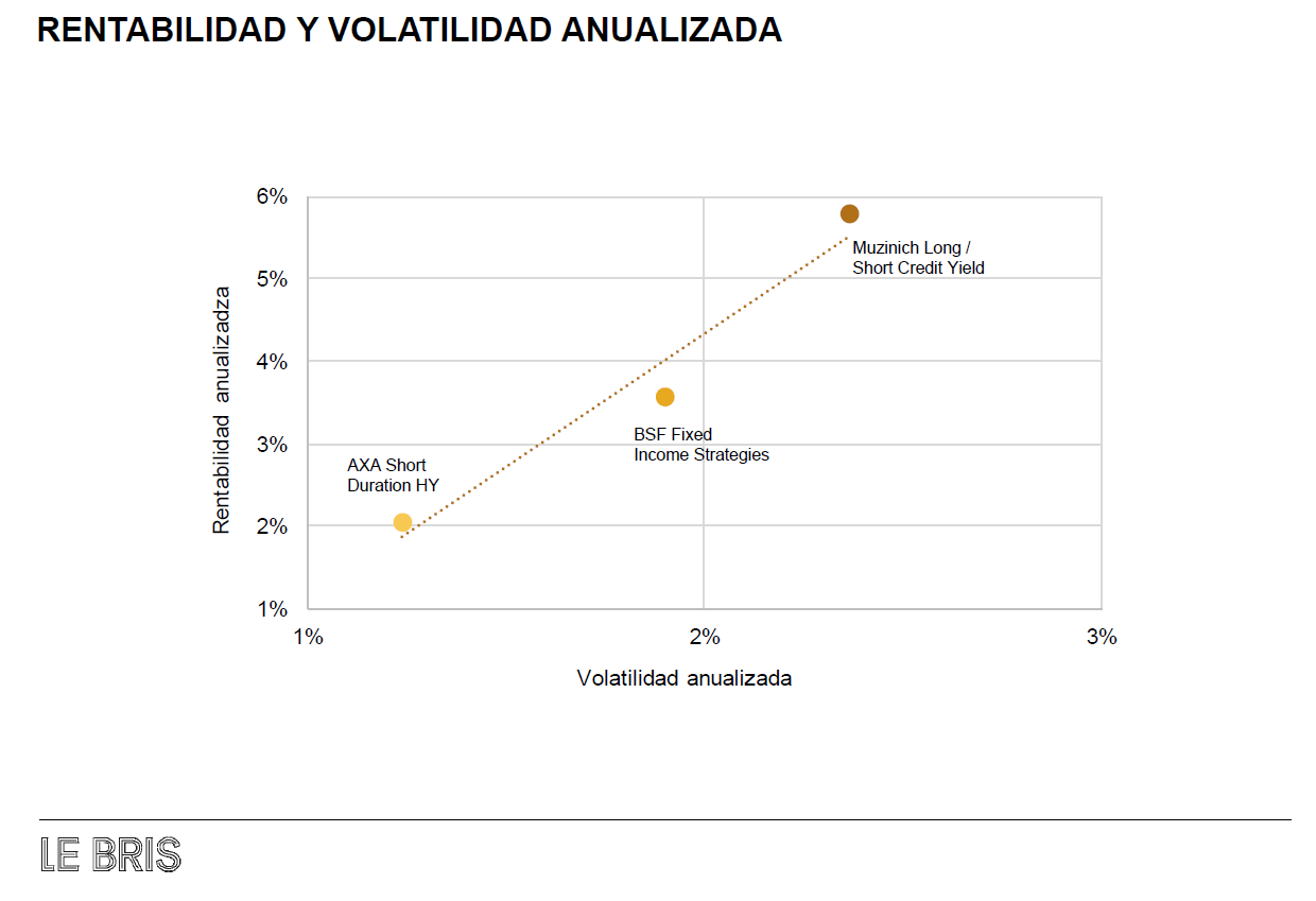 - Los fondos tienen una volatilidad comprendida entre el 1% y 3%, en línea con la volatilidad de los fondos tradicionales short duration y por debajo de las categorías de deuda pública, corporativa y high yield.