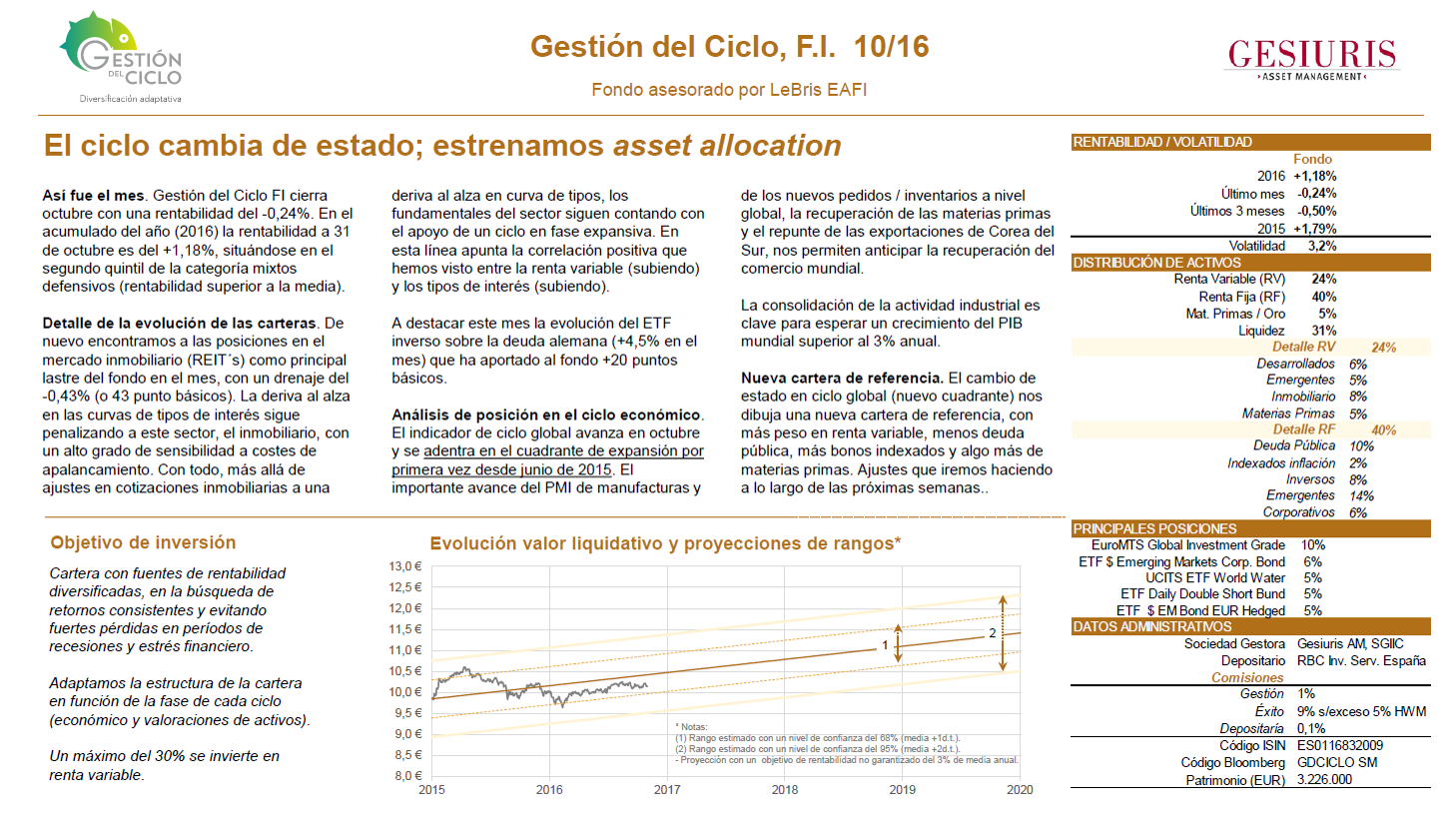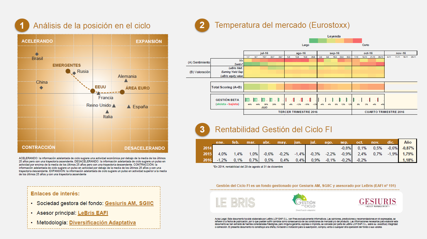 Así fue el mes. Gestión del Ciclo FI cierra octubre con una rentabilidad del -0,24%. En el acumulado del año (2016) la rentabilidad a 31 de octubre es del +1,18%, situándose en el segundo quintil de la categoría mixtos defensivos (rentabilidad superior a la media).