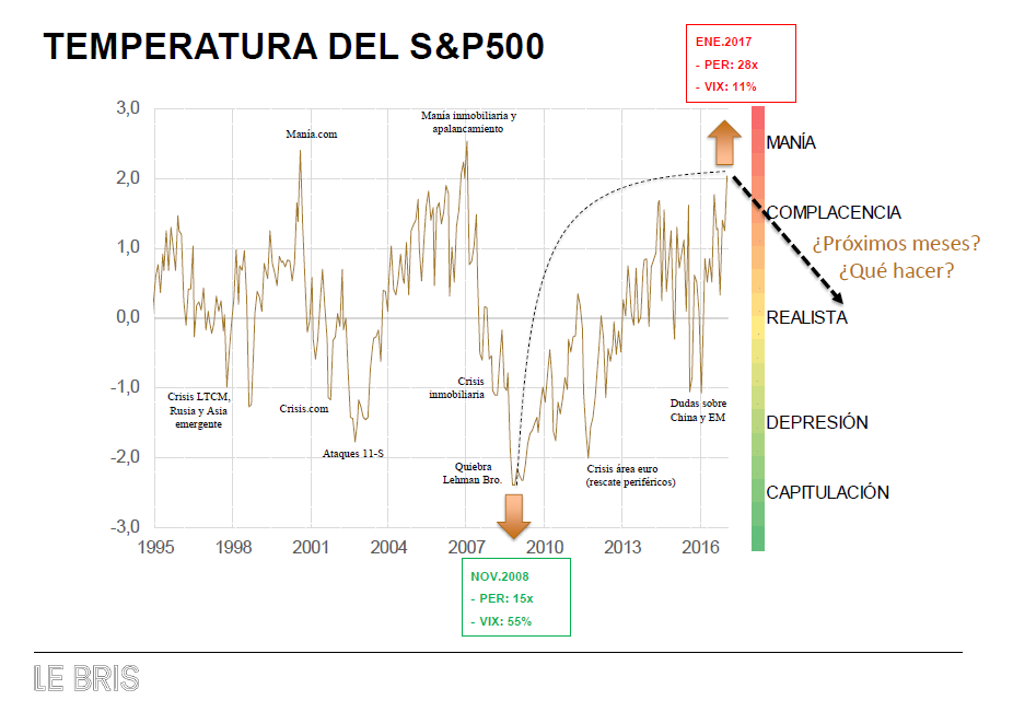Noventa y ocho meses ha tardado el “péndulo” del S&P 500 en pasar de un extremo (“capitulación” en noviembre de 2008) al otro (“manía” en enero de 2017). Una capitulación caracterizada por síntomas de depresión, infravaloración, pánico y aversión al riesgo en aquel cuarto trimestre de 2008. Y una manía donde observamos algunos de los síntomas característicos de esta etapa (sobrevaloración y cierta complacencia), pero donde faltarían algunos elementos claves como la codicia o un apalancamiento en máximos del ciclo.
