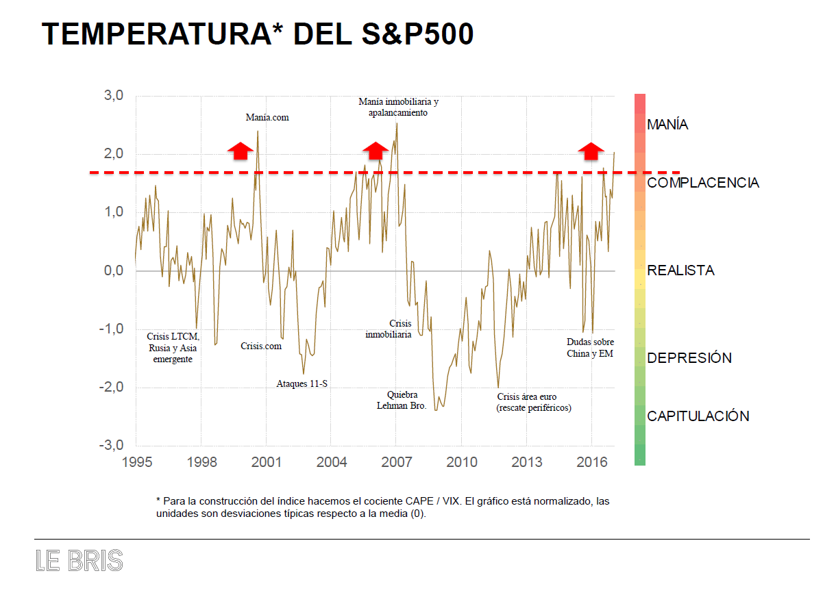 La última lectura de un S&P 500 entrando en complacencia es de julio 2016. Han pasado 7 meses desde entonces y el índice está más de un 5% por encima de los niveles de entonces.