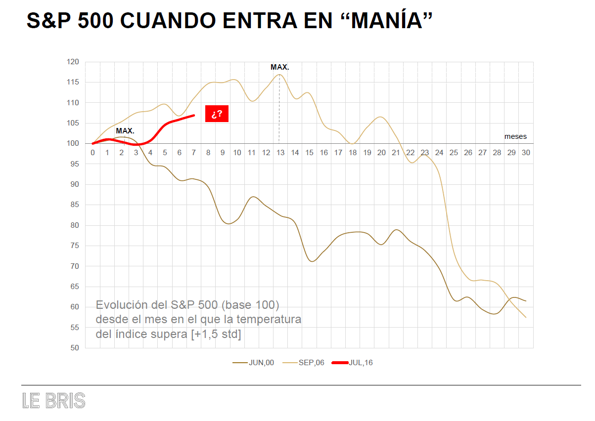 Tres son las observaciones: junio-00, septiembre-06 y julio-16. En estos tres puntos observamos una temperatura del S&P 500 profundizando en complacencia y aproximándose a un estado de manía. En el siguiente gráfico comparamos la evolución en los meses posteriores a esta entrada en complacencia. Establecemos base 100 para facilitar la comparación. Se puede observar que en el año 2000 la temperatura del S&P 500 entró en complacencia en el mes de junio, y el máximo de ciclo lo estableció relativamente pronto, solo 2 meses después.